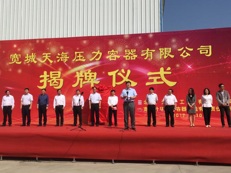 5月10號,寬城天海壓力容器有限公司舉行揭牌儀式。揭牌儀式由寬城縣縣長楊海龍主持,控股公司總經(jīng)理王國華,副總經(jīng)理王軍和寬城縣委書記祁海東等寬城縣四大領導班子主要領導出席了揭牌儀式。